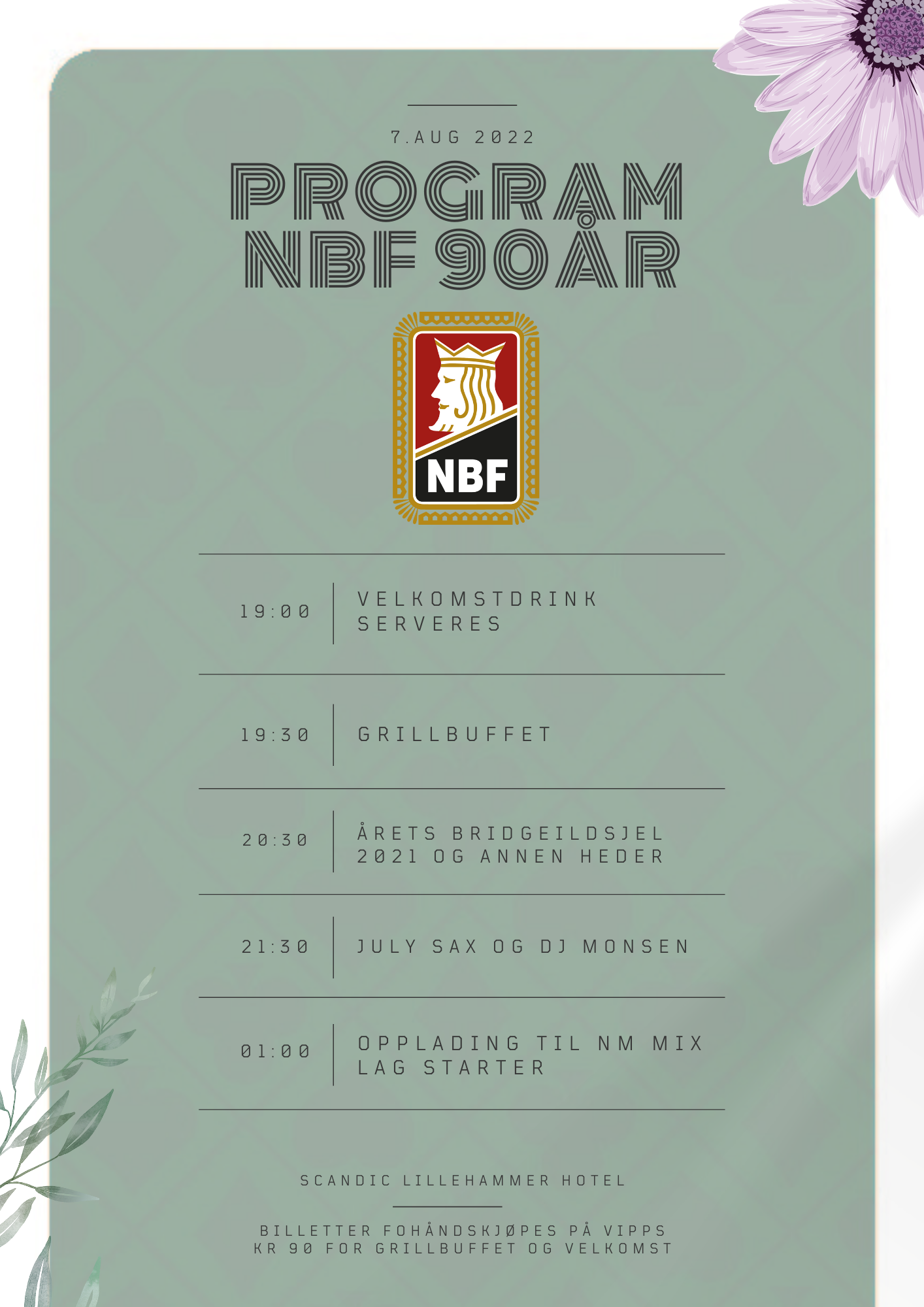 Endelig kan vi møtes igjen uten begrensninger - og hva passer vel da bedre enn at vi samtidig kan feire at NBF er 90 år? Søndag 7. august møtes vi på Lillehammer til grillfest, utdeling av årets bridgeildsjel (2021), litt mimring, dans og moro. Prisen for festen er kr 90 og inkluderer grillmat, velkomstdrink og underholdning. I tillegg kan man på Lillehammer kjøpe bonger for rabattert drikke. Påmelding gjøres på VIPPS ved å vippse kr 90 til VIPPS#: 759042 Vi skal dele ut NBFs viktigste pris; Årets bridgeildsjel for 2021, samt andre priser. I tillegg blir det taler og mimring fra NBFs lange historie. Utover kvelden blir det variert musikk det kan danses til - og for å levere musikken har vi DJ Monsen og July Sax (gjett hva hun spiller!?). Så nå skal vi kose oss og feire oss selv! Vi håper å se alle der!