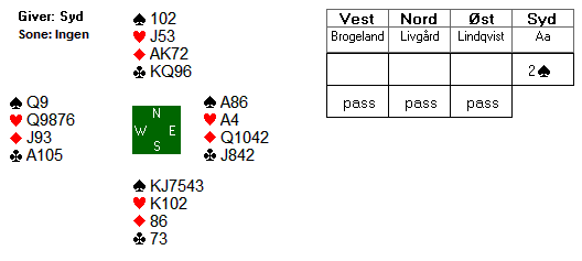 Etter esset i fyrste stikk, heldt Aa fram med ein spar til knekten og dama. Brogeland tok det framleis heilt med ro, ingen paniske skift der, han spela ein ny ruter. Spar ti stakk Lindqvist med esset, for å skifte til ein liten hjarter. Han visste jo at makker måtte ha kløver ess, så om det no skulle vera kongen og ikkje dama Brogeland hadde i hjarter, ville det uansett ikkje bli nokon øydeleggjande blokade.