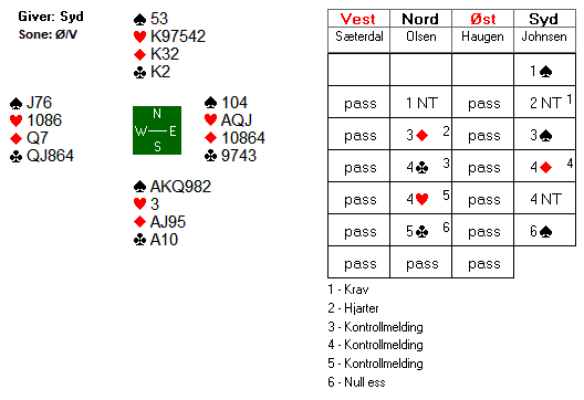 Slemmen er riktig nok i hardaste laget. Sit ikkje trumfen 3–2 er jo alt mørkt, og sjølv om han sit, er ein avhengig av at noko hyggeleg skjer i dei raude fargane. Sit hjarter ess framfor, er det nok med ein ruterfisk. Sit hjarter ess tridje framfor, kan ein til og med få god hjarteren, slik at ein ikkje blir avhengig av ruterfisken. Eller – siste moglegheit – motparten kan koma til unnsetjing i utspelet. I praksis var det det som skjedde, då vest valde å sørve ruter dame! Det ser unekteleg spesielt ut med dame, knekt i kløver på si, men til hans forsvar skal det seiast at makkeren hans kunne ha dobla kontrollmeldinga 4 hjarter. Nord–sør kan i teorien redoble og vinne ti stikk i 4 hjarter, men etter mi meining bør ein nytte alle høve ein får til å hjelpe makker med utspelet. Med ruter dame ut var alt is og brus for Johnsen, for sjølvsagt saga ho opp ruter ti i aust. Med eit anna utspel vågar eg vedde nokre kronestykke på at ho hadde gått beit. På det andre bordet var kontrakten berre 4 spar, så dette gav 11 IMP til lag PGAH. Det siste spelet vi skal sjå på, skriv seg frå den nest siste kampen i dag, der leiarlaget møtte lag Norges navle. Også på det andre bordet valde Johnsen i vest å ta det med ro over sør si grandopning, og buskpassen gav full utteljing, då motparten i neste augneblink var i 3 grand. Det var berre å halde fingrane unna den freistande raudlappen, og innkassere dei sju fyrste stikka i motspel. Tri sonebeiter. Men mot Chediak–Fasting vart vest utolmodig etter Stayman-sekvensen. Det blir litt inkonsekvent, etter mi meining må ein anten hive seg inn i fyrste melderunde, eller satse for fullt på den ambisiøse planen om å få spela imot ein grandkontrakt. Eg gissar på at Espen Fasting hadde tenkt å melde grand over makkers 2 ruter, men no gjorde han sjølvsagt ikkje det. 3 ruter var ei naturleg melding, neppe nokon sleminvitt etter førehandspass, men ein sterk indikasjon på manglande sparhald. Chediak hadde heller ikkje sparhald, så ho støtta ganske enkelt ruteren, og Fasting konkluderte klokeleg med at 5 ruter ville vera i overkant. Aktuelt var det akkurat ti stikk, for 130 og 10 IMP til lag PGAH. Held dei fram med den gode og heldige spelinga siste del av tevlinga, kan dette laget bli vanskeleg å slå. Men det er nok mange som ikkje har tenkt å gje seg utan kamp, så her skal det bli spennande å fylgje med.
