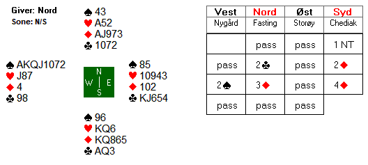 ![]() På det andre bordet byrja meldingsforlaupet identisk, men nord valde å passe over vests 2 ruter, meir normalt slik eg ser det. Virginia Chediak høyrde då makkeren preferere til 2 spar, og melde vel kanskje ein tanke for hardt då ho gjekk på ein gong til med 3 ruter, mot ein makker som høgst sannsynleg har fåe honnørpoeng, dobbel spar og maks tre ruter. 2 spar kunne vorte interessant, men 3 ruter måtte bli beit.