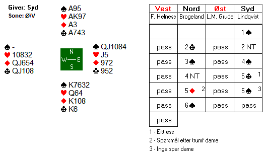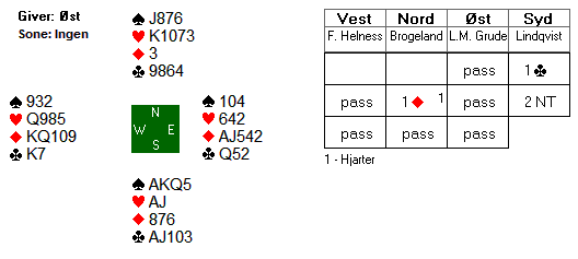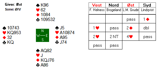 ![]() Lindqvists dobling av den gode hjarterlyften 2 ruter var tilsynelatande opplysande mot hjarter, og Brogelands 2 grand må ha vist interesse for å kjempe i minor. Men det vart slutt på meldingane då Grude hoppa til 4 hjarter. Kontrakten går ei enkel beit med ruter ut. Diverre er Brogeland ein tenksam spelar: Han meinte at motspelarane her kanskje trong ein del stelingar her, og valde difor ein trumf i utspel. Det var sjølvsagt litt uheldig at det skulle sitja akkurat slik at kløveren no kunne setjast opp til eit ruteravkast, men sånn var det. Ti stikk, 620.
