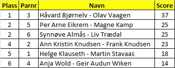 Resultater fra første kveld vår 1, 3 kvelder sammenlagt. Resultatene ser du her.
