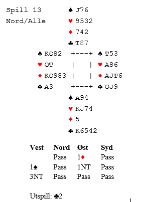 Et svært interessant og instruktivt spill. Det er ingen ting å si på om syd dobler opplysende over østs 1 ruter. Å doble er bedre enn å melde inn 2 kløver da syds kort kan passe godt i kontrakt med spar, hjerter eller kløver som trumf. Vest er nesten så sterk at han kan tenke på lilleslem i ruter, men mot 12-14 balanserte har han litt i minste laget. Det er da også en dårlig slem som bare har visse sjanser fordi alt sitter riktig. Og 6 ruter kan fyke hjem!