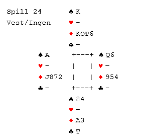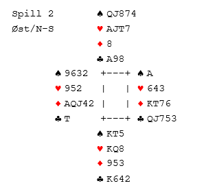 Nord spiller enten delkontrakt i spar, eller en hardmeldt 4 spar. Det er perfekt tilpasning og ser ut til å være kun tre tapere. Som sagt i mine kommentarer til spillet blir det dog vanskelig om det spilles ut ruter fordi spillefører blir kortet i trumf med det samme, og en gang til idet øst er inne på trumfesset. Da blir vest "sjef" i trumf.