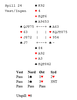 Det ble på en måte feil av øst å la N/S spille 3NT, men han gjorde nok det fordi han hadde et håp om bet i den kontrakten med inntak til den lett godspillbare hjerterfargen. Med hjerter ut er det imidlertid ti sikre stikk, og det blir elleve om spillefører får fire ruterstikk. Selv om vest skulle finne på å spille ut spar dame mot 3NT er det ti stikk hvis spillefører dukker fra nord to ganger slik at Ø/V sin spar blir blokkert. Den starten (spar dame i utspill) gir imidlertid et kjedelig valg, og det kan bli lang nese hvis det dukkes fra nord to ganger, for etter spar dame vinner første stikk og spar knekt andre stikk kan det jo hende vest spiller esset i tredje stikk! Han kunne jo hatt AQJ femte eller sjette fra start.