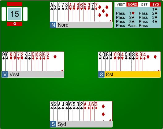 På det andre bordet spilte de 4 hjerter med 8 stikk, heller ikke det et meldingsforløp for pyser.