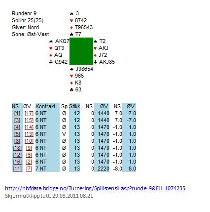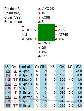 Bra oppmøte og 9 bord kan vi være bekjent av. Vestnesingene erobret toppen på en innholdsrik kveld der vi også fikk muligheten til å utsette redaktøren (PeTo) for Vienna Cup i spill nummer 25. Vi var kommet i 6 NT og PeTo spilte ut en liten spar. Vi stakk med ess i bordet og tok for kløver dame, ruter ess og så alle stikka i kløver og hjerter. På den 5 kløveren kasta vi ruter dame i bordet. etter at PeTo motvillig hadde droppa den siste sparen vi trengte for å claime tretten stikk. Med denne spilleføringen får vi 13 stikk med alle varianter der samme personen som har 4 spar også har ruter konge. Gøy, og slett ikke hverdagslig.
