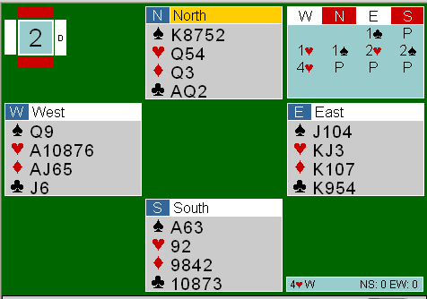 Liten spar kom ut til kongen i syd, og jeg la spar dame. Inge spilte liten spar til min nier, og Helge sin ess. Helge la ned kløver A og ny kløver. Jeg turde ikke annet enn å stikke med kongen.. Så var det å telle poeng. Med hjerter dame, har Helge 11 poeng.. Spilte hjerter til esset, og hjerter til kapp med knekten.. Så hjerter konge, og all trumf var ute. Inge kastet ruter på den siste trumfen.. Tok for spar knekt, og kastet en ruter på hånden. Spilte så liten kløver til trumf, hvorpå Helge la damen... Spilte så min siste trumf for å se om jeg fikk telling. Helge legger lett damen i kløver, selv om han har Q-10 .. Helge la en liten spar på min siste trumf, jeg la en ruter i bordet og Inge kastet nok en ruter. Da har jeg K10 i ruter, og kløver 9 i bordet. På hånd har jeg Ajx i ruter.. Spiller så liten ruter til kongen, og nord syd følger på med små ruter.. Spiller ruter 10 fra bordet, og Inge følger med nok en ruter.. Finner ut at her ikke er en skvisvariant, og at Inge må ha kløver 10 og en ruter igjen, mens Helge må ha ruter Q og en spar igjen.. Går så opp på ruter A, og kontrakten går hjem... Etter en litt tung dag, ble det iallefall en opptur til slutt.