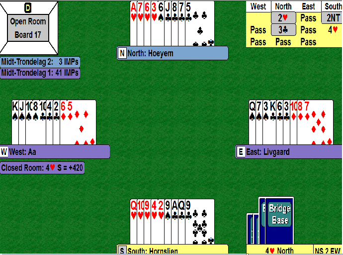Med forbehold om at det som ble vist på BBO fra det andre bordet er riktig, så må det sies at spillefører i 4 hjerter der gjorde en feil. Han fikk spar ut og lasjerte! Da kunne forsvaret tatt sine to ruterstikk og fridd seg med spar eller trumf. Med tre stikk i boks og inspillsmuligheten forsvunnet vil da spillefører måtte avgi kløverstikk - betestikket.