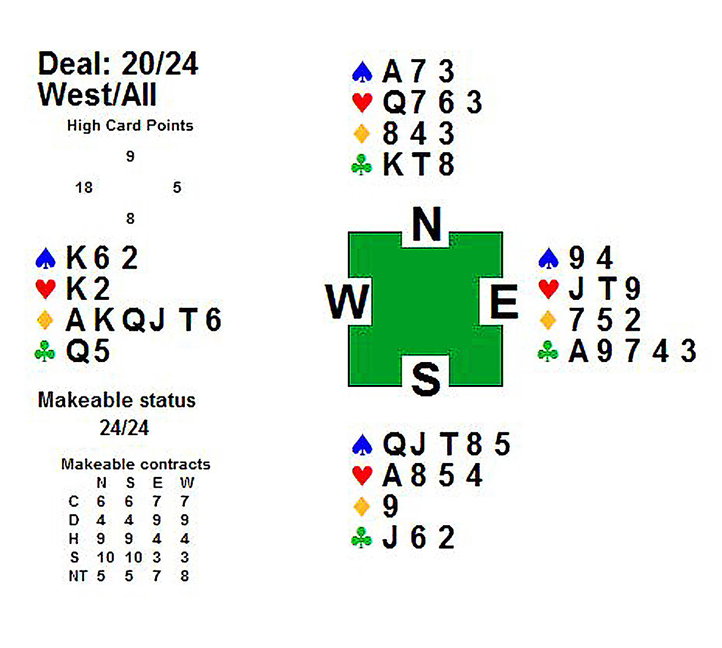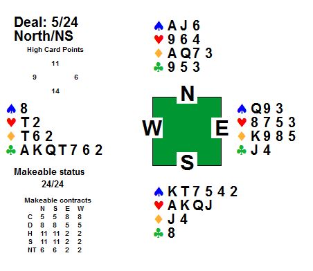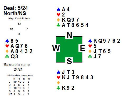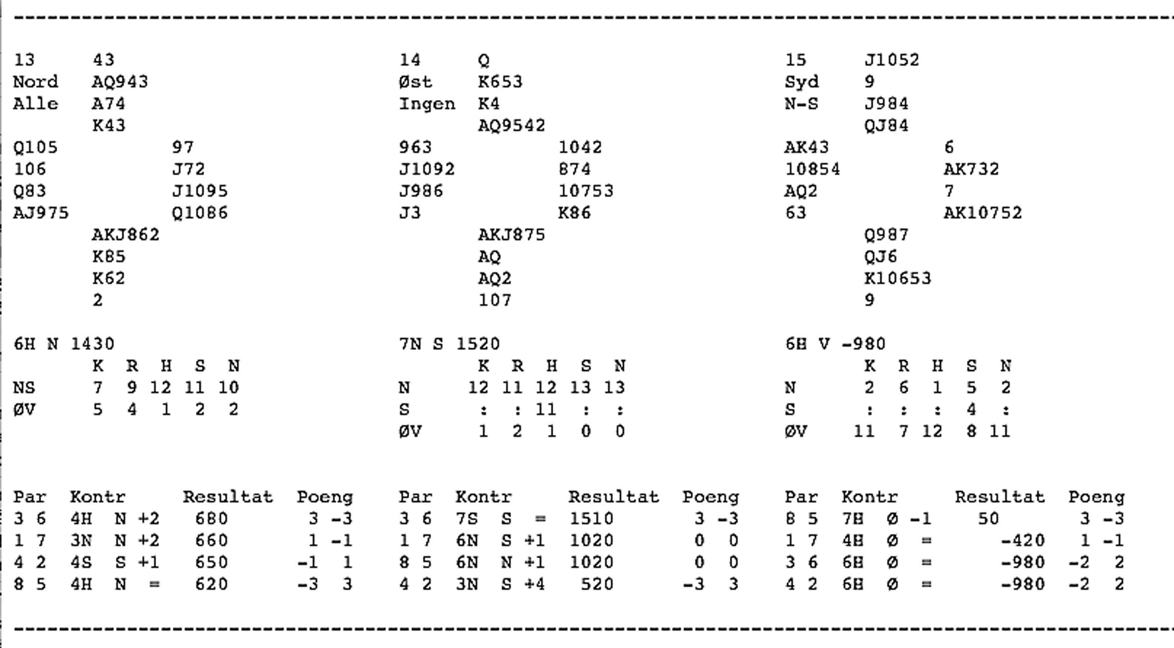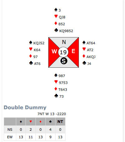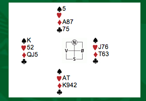 Første spelet var det tolv stikk i hjarterkontrakt. Ingen nord-syd-par klarte å melda denne slemmen, men ein speleførar fekk i alle fall tolv stikk. Dei som fekk mindre stikk har sikkert prøvd sparfinessen, men beste speleplan er sikkert å spela tre gonger spar frå topp og bruka ruter konge som inntak til dei godspelte spar-stikka. Det gjev 5 sparstikk, 5 hjarterstikk og 2 ruterstikk så lenge begge majorfargane sit 3-2 hos motparten. Neste spel var det enno fleire stikk, 13 i både spar og grand. 6 sparstikk, 3 hjarterstikk 3 ruterstikk og eit kløverstikk kunne innkasserast frå taket her. Til slutt var det aust-vest som hadde slem. 12 stikk i hjarterkontrakt denne gongen, og kun trumfen 3-1 imot gjorde at det ikkje var 13 stikk i dette spelet og. ---------------------------------------------------------------------------------------------------------------------