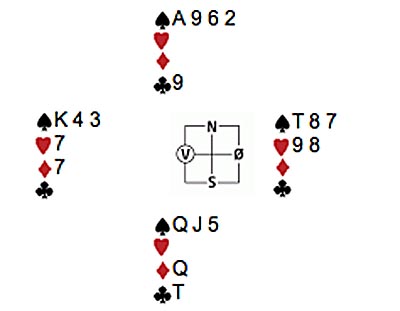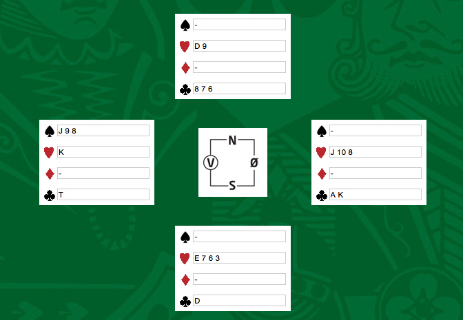 Olav i vest blei speleførar i 1 NT, og Inger Marie i nord spelte ut ein liten hjarter. Vilhelm i syd stakk med esset og vrei til spar dame. Olav la liten tre gonger, og Inger Marie kom inn på spar-esset etter tre gonger sparspel og fortsatte i femte stikk med hjarter til Olav sin konge. Alt låg no til rette for ein skvis mot nord i hjarter og kløver. Med ruter frå topp er stillinga denne med tre kort igjen: