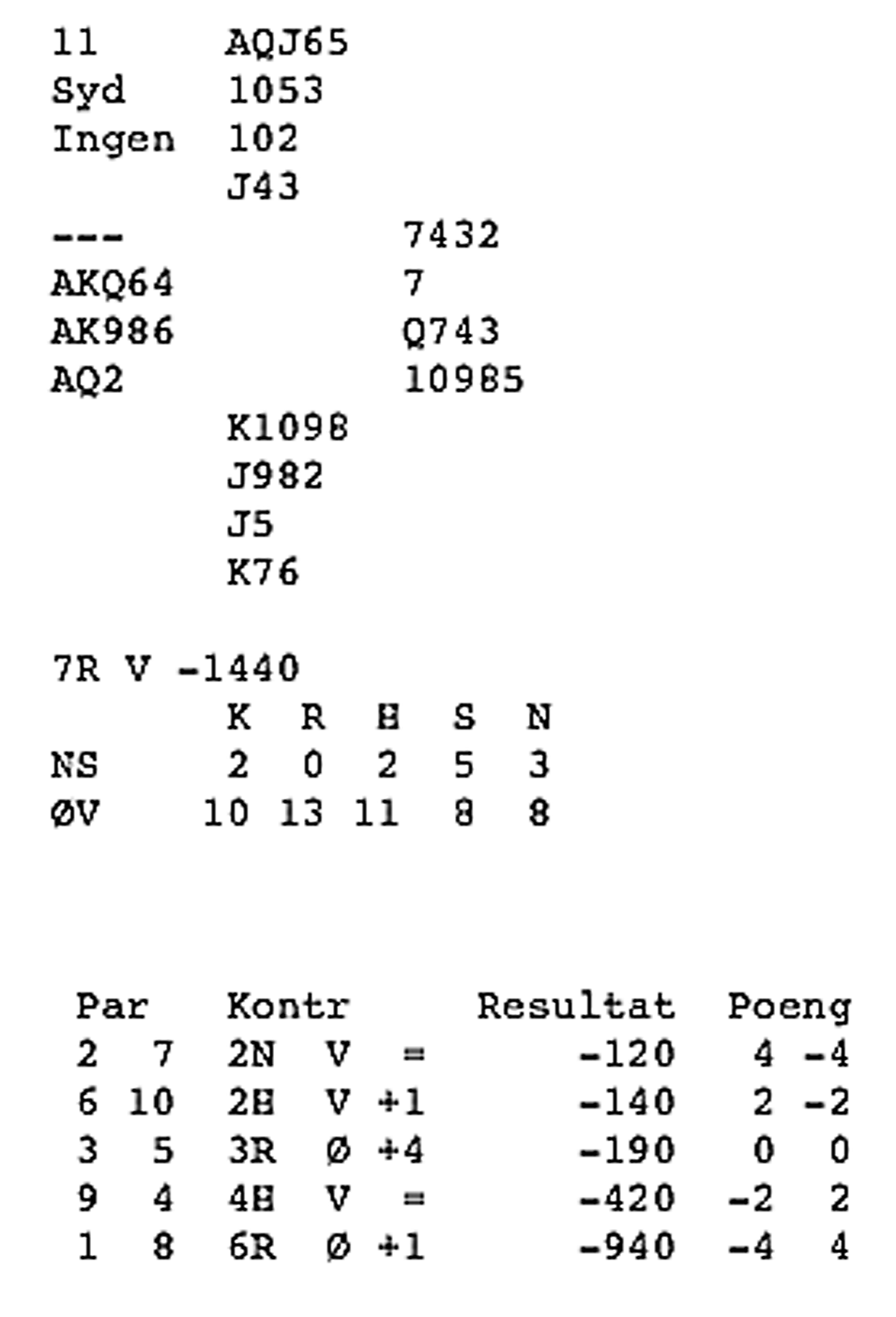 Meldingane gjekk slik: N A S V P 2 ru* 3 kl 3 sp 4 kl 4 sp 5 kl pass rundt * 2 ru = søppel-multi, 0-7 poeng