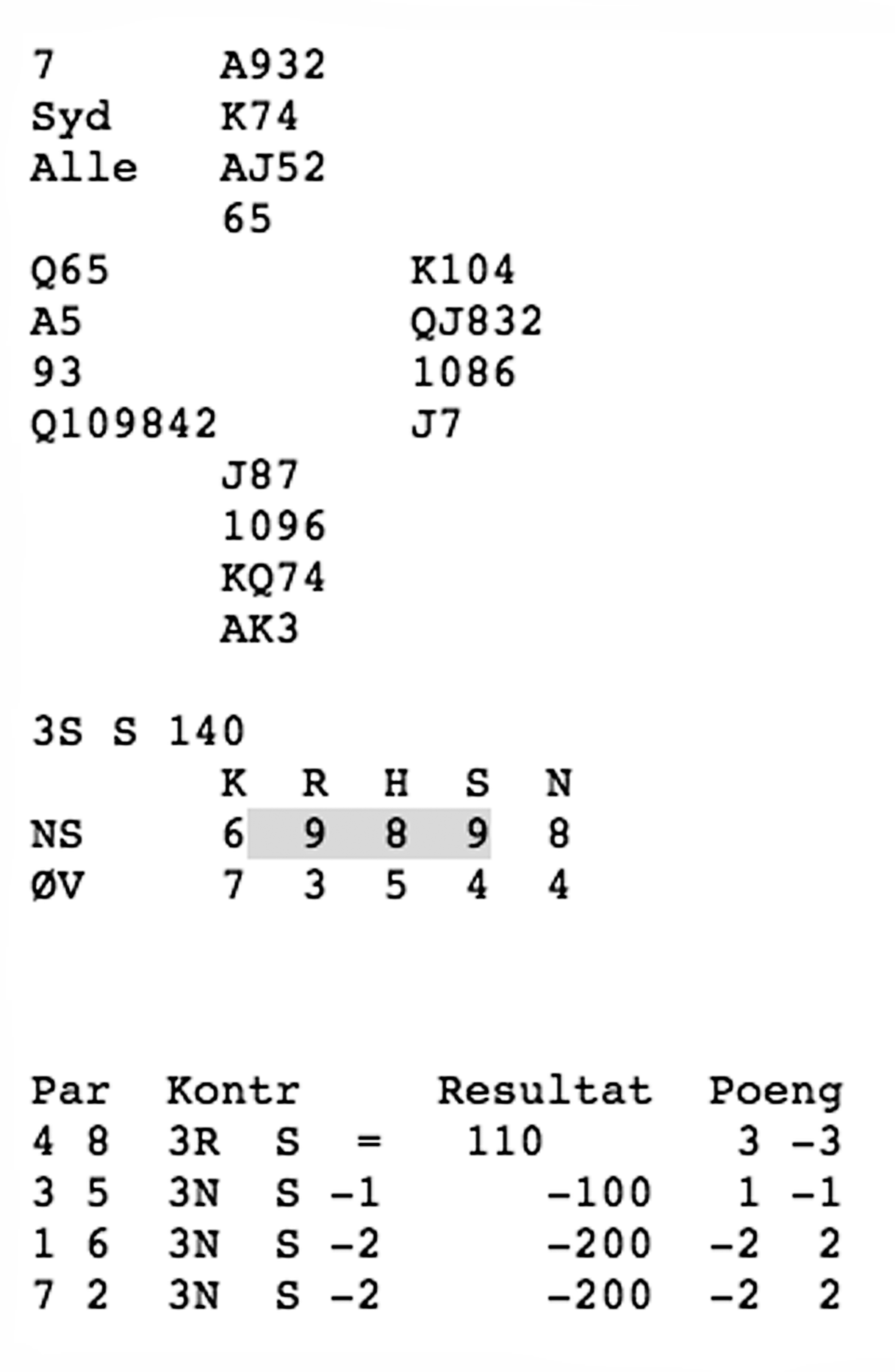 Kontrakten blei 3 NT på nord si hand, etter eit meldingsforløp der Anne Merete i aust hadde vore taus om sparfargen sin, medan Torhild i vest hadde vore inne med ei rutermelding. Med eit slikt meldingsforløp var ikkje ruter knekt ut frå Anne Merete unaturleg.