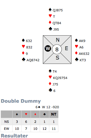 Denne gongen ordna alle fargane seg fint, og storeslem i ruter kunne vore meldt med hell, men 6 ruter må vel vera optimalkontrakten på spelet og ville vel gitt 10 poeng om spelet hadde vore gitt som meldeoppgåve i "Duellen" til BIN.