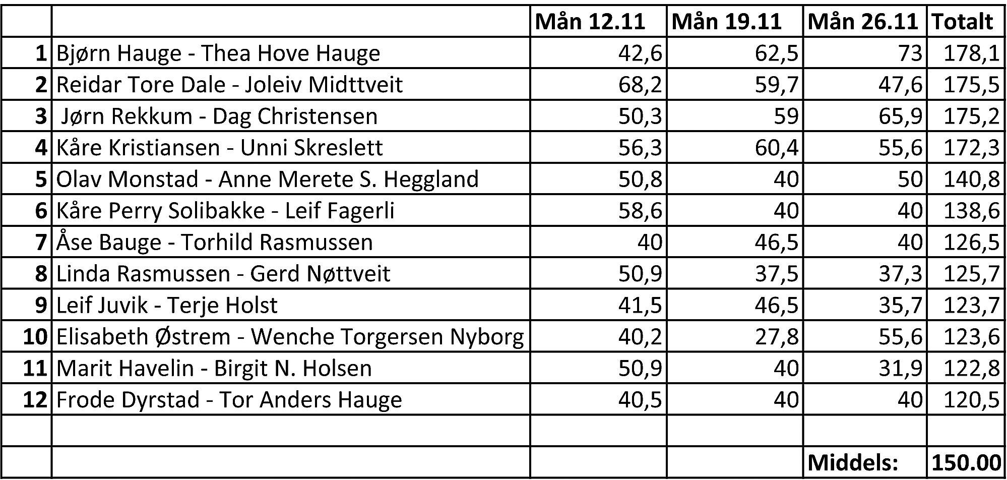 Etter at 2 av 3 kvelar av klubbmeisterskapet var spelt såg det ut til at Reidar Dale og Joleiv Midttveit skulle ta heim klubbmeisterskapet. Men siste spelekveld av turneringa gav store endringar på samanlagtlista. Thea og Bjørn Hauge auste inn poeng, og med 73 % score på kvelden vann dei kvelden suverent og tok like godt heim klubbmeisterskapet i same slengen. Gratulerer til dei! Jørn Rekkum og Dag Christensen hadde og ein god kveld. 65,9 % score på kvelden gav 2. plass på kvelden og tredjeplass samanlagt.