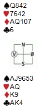 Meldeprøve 1 så slik ut, og etter 1 kløver i nord og 2 kløver (omvendt minor) i sør, hopper vest inn med 3 hjerter! Hva nå?