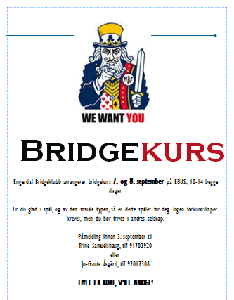 Engerdal BK holder bridgekurs med oppstart 7. og 8. september på EBUS, 10 til 14 begge dager. Vi inviterer også interesserte utenfor Engerdal til å delta! Vi arrangerer det som et oppstartskurs, så er det opp til klubbene å ta vare på sine kursister i fremtiden. Påmelding til Trine (91702920) eller Jo-Gaute (97017308) innen 3. september.