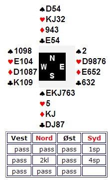 Mot meg som spillefører i syd spilte Helge Stornes ut en trumf etter meldingsforløpet til venstre. Jeg stakk hjemme og spilte hjerter. Ikke vet jeg om det er rett tenkt, men en spiller som serverer trumf har ofte et ekkelt utspill. Derfor har han oftere hjerter ess enn dame, så jeg gikk opp på hjerter konge når Helge la liten. Det var rett. Så tok jeg ut trumfen (inne i bordet) og spilte kløver til damen min. Helge vant med kongen og fridde seg i kløver. Inne på kløver ess måtte jeg spille ruter. Helge hadde vist hjerter ess og kløver konge. Med ruter ess i tillegg hadde han sannsynligvis åpnet, så da ble det ruter til kongen og 11 stikk.