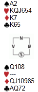 Sikkert er det nok at Frank og makker ikke ligger i posisjon til å kreve mesterskapstittelen, og gårkveldens siste spill bidro nok i den retning. Som i forrige uke plasserte makker meg i lilleslem sent på kvelden, og det kunne jo ikke gå bra. Jeg satt syd, og hadde havnet i 6 ruter etter et noget suspekt meldeforløp. Vest har vist spar, og øst har støttet, makker i nord har vist hjerter. Videre meldeforløp kan fåes ved betaling. Liten spar kommer ut fra vest:
