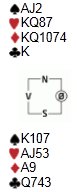 Motparten sperreåpna i 3kl i øst i dette spillet (spillet er vridd), og makker gikk inn med 3nt i syd. Vitenskapen ble satt til side hos den praktiske heggerisingen i nord, og 6nt ble lagt i bordet. Liten kløver fra vest til esset i øst og ny kløver, så er det din tur: