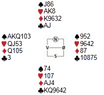 VIDEOSNUTT FRA LUKKET ROM Den første runden på BBO var ingen suksess for arrangøren, men vi lar det gå som oppstartsvansker og gir dem en sjanse til for å få teknikken på plass. ------------------------------------------------------------------------------------------------------------------------------------------------------------------------------- Jeg starter med et spill fra kampen mellom Stavanger og Vikersund. Jan Fjælberg skulle spille 3NT etter av øst-vest hadde meldt og støttet spar. Den fargen satt jo 4-4, så da kan du prøve å finne ut hvordan rogalendigen gikk beit?