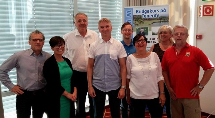 Det har i lang tid vært fyret opp under det som så ut til å bli en presidentkamp på Bridgetinget 2014. Valgkomiteen har fått tidvis hard medfart for sin innstilling av Jostein Sørvoll, noe som i praksis betydde at de foreslo å kaste en sittende president, Jan Aasen, som ønsket gjenvalg. "Alle" forventet at det ville komme benkeforslag på Jan Aasen, men det skjedde ikke. Valgene forløp helt udramastisk og Jostein Sørvoll ble enstemmig valgt. Det kom heller ikke motforslag til verken visepresident, styremedlemmer eller varamenn/kvinner. Under ser du hvem som skal lede oss de neste to årene. Fra venstre: Reinhold Fieler, 1. vara (ny) Eva Flått, Nord Trøndelag, Jostein Sørvoll(ny), Oslo, Knut S. Brinchmann, generalsekretær, Kristian B. Ellingsen, Astrid Steen Lybæk, Kari Anne oppsal (ny), Tom Danielsen (var 1. vara forrige periode), Anita Karlsen (ny) var ikke til stede Tidligere i kveld tok jeg en telefon til styremedlem Astri Steen Lybæk for å få litt inside information. Mitt første spørsmål var selvsagt hvor det ble av det forventede benkeforslaget på Jan Aasen, men det kunne hun rett og slett ikke svare på. "Jeg snakket med mange av representantene i helga, selvsagt ikke bare om valget, men det var ingen som sa direkte til meg at de kom med mandat fra sin krets om å foreslå Jan Aasen", sier Astrid. "Da forløp hele valget svært udramatisk og vi ungikk det som kunne blitt en lei sak mellom to fløyer. Stemingen var god hele tiden og spør du meg har vi fått et svært kompetent styre. Det er en fin blanding av menn og damer, det er en fin blanding av folk med ulik erfaring og kompetanse og det er en fin blanding av folk med ulik tilnærming til selve bridgespillet. Kristian Barstad Ellingsen er spiller på toppnivå, noen av oss middelhavsfarere pluss/minus, mens andre har sine bein mer i hobbybridgen. Jeg ønsker også å trekke fram en sterk innsats av Kari-Anne Opsahl som var med å sikre prosjektet 5,8 millioner fra Troms Fylkeskommune. Hennes kompetanse blir viktig å ta med seg videre og det er også viktig at de nordligste fylkene, Troms spesielt, er sentralt plassert i organisasjonen." Jeg spør litt mer om bakgrunnen for at hun og Eva Flåtts stilte ultimatum for sitt kandidatur. Ble ikke Sørvoll president, trakk de seg begge. "Før du får svar på noe, Snorre, så har jeg et sterkt behov for å si at det er ikke noen konflikt mellom oss og Jan Aasen. Hvis noen har prøvd å få det til å høres ut som noe i den retning, så stemmer ikke det. Jan har vært en dyktig leder på mange områder, vi har hatt en hyggelig atmosfære på styremøter og vi har hatt en fin blanding mellom skjemt og alvor i vårt samspill. Vi har ikke vært enige i alle hans forslag og prioriteringer, men det er i hovedsak ønsket om et skifte som har vært det viktigste for oss. Økonomien i EM-prosjektet har jeg hatt en uggen følelse av lenge og der har jeg rett og slett mer tro på at Jostein Sørvoll kan hanke inn de manglende 3 millionene. Det er pr.dato ingen signerte sponsoravtaler og heller ingen konkrete lommebøker som har sagt seg villig til å bli åpnet for EM Tromsø 2015. " Terje Skjelbred fra Vest-Agder har også holdt meg oppdatert om saker på tinget og sier blant annet om økonomiplanen. Terje sier blant annet : "Økonomiplan ble godkjent under diskusjon. Salen mente rimelig sterkt at Norsk Bridge skulle bli digitalt for å spare penger samt komme mer oppdatert og aktuell . Videre ble det bestemt at vi så fort som mulig skal endre i ifra at ikke medlemmer skal automatisk bli medlemmer etter 3 kvelder til at ikke medlemmer skal måtte kreves for 50kr mere i service avgift av forbundet. Dette skal senest tre i kraft ifra 01.01.15. Nå er det valg snart, Snurr, så jeg må avslutte. Det virker som Aasen ikke stiller, hmm" Jeg håper å komme tilbake med noen ord fra både Jostein Sørvoll og Jan Aasen. Jostein ønsker sikkert å presentere seg enda grundigere for oss og mitt håp er at han blir en mer synlig president enn Jan Aasen. Det er alltid fint å se fjeset til sjefen. Han trenger ikke alltid å ha med seg godterier, men at det oppleves at han er en av oss, er bra. Herved er presidenten invitert til å stille i det åpne lagmesterskapet i Fredrikstad. Skulle jeg være så heldig å møte han, skal jeg gjøre alt jeg kan for at det ikke blir et eneste IMP igjen den veien. Jan Aasen fikk takk for lang og tro tjeneste, men hvis mine referenter er pålitelige, følte de at det gikk litt fort på slutten. Vi håper NBF snarest får gitt Jan den ros og heder han fortjener for sin lange innsats. Han er nok skuffet over utfallet av valget, men tar helt sikkert nederlaget med fatning og ønsker det nye styret lykke til. Jan spiller neppe NM lag, men jeg håper vi ikke har sett han for siste gang i bridgemiljøet. Velkommen til å si noen ord, Jan. Er det noen av dere lesere som har noe dere ønsker å si, er kommentarfeltet åpent for alle som kan logge seg på.