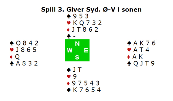 I åpent rom startet Øst med 1 spar, og Ellingsen i Syd hoppet inn med 3 kløver. Der døde det, og 100 ut for to bet så ikke bra ut. Det var fullt mulig for Ø-V å komme for høyt i hjerter. Men det skulle vise seg at frykten var ubegrunnet. Også ved det andre bordet åpnet Bakke med 1 spar, og Syd meldte 3 kløver. Nå doblet imidlertid Hegge negativt, og Bakke tok ut i 3 NT med pass rundt.