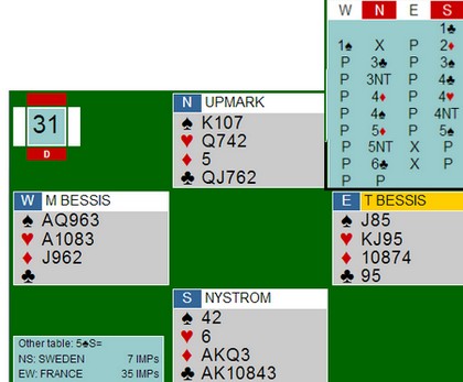 og da finner de vel ut av det de trenger? Nei, dessverre er det ikke alltid lengden det kommer an på. Fredrik Nystrøm hadde et spørsmål til makker. "Hvis du sparkontroll og et ess, da kan vi spille 6kl?" . Han fikk for så vidt svar på det han lurte på, men da var de allerede i 5ru! Noen ganger er det best å spill 1430 svar på Blackwood, mens andre ganger er det 0314 som funker. Nå prøvde de å buklande i 5NT, men Bessis var frampå med rødlappen når han skjønte at makker hadde majoressene. Hans hjerterkonge var beita i 5NT, denne gangen mange beit om NS hadde stoppet der. På det andre bordet gikk det omtrent likt til syd hadde reversert i ruter. Da hoppa nord til 5kl og meldingene stoppa der. Jeg skal ikke lære noen i hele verden å melde, men jeg føler at svensken i nord avga minst et cuebid for mye med sin essløse hånd. Det er noen som mener at cuebid under utgang ikke nødvendigvis viser tillegg, men hvordan skal syd vite om nord har Exx,Exxx,x,xxxxx (7kl er nedbrett) eller den hånda han har?