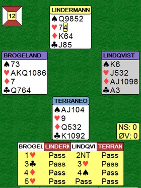 Boye får trumf ut og spiller tøft. Hadde han bare hatt et par mindre hjerter på hånda, ville han rukket både å godspille og hente ruteren, men det går ikke nå. Trumfen stakk han på hånda og spilte ruter til esset og ruter til stjeling med trumfesset. Så hjerter til bordet s knekt og nok en ruter til høy stjeling. Ut med den siste trumfen og en litt anonym kløver seks (ikke fireren) mot bordet. Nord sov like mye som syd gjorde i andre spill, så han la femmeren sin. (skulle lagt åtteren uten at det betyr noe denne gangen) Boye la elegant en liten og hadde sparkongen beskyttet. Nå hadde Boye laget seg to inntak (kløveresset og en kløverstjeling) til først å godspille den trettende ruteren, så hente den. Aktuelt hadde det gått like fint å stikke med kløveress og spille kløver mot damen, men det hadde blitt feil med kongen i nord.