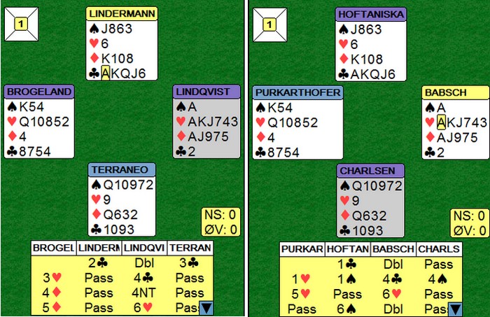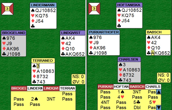 er en konvensjon nesten alle norske spillere på et visst nivå bruker. Det finnes mange varianter, men jeg tror den vanligste er omtrent slik: 1M - 2NT Ny farge viser (litt) tillegg 3M er det svakeste en kan melde. 1M - 2NT 3X - 3M spør etter singelton, 1M - 2NT 3X - 3NT spør etter ekte kontroll. Dette er vel og bra, men problemet noen ganger er at verken åpningshånda eller svarhånda får vist styrken skikkelig. De er ingen som på en måte kan slå av for tidlig, fordi makker kan være sterk. Her er et spill fra kampen mot Østerrike som viser hva jeg mener