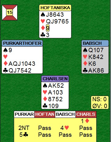 Til tross for at Norge er helt i teten, har jeg skrevet om flere spill der jeg mener Norge kunne (burde) gjort ting enda bedre. Hoffa og Thomas synes jeg har meldt både grisehardt og dårlig på flere spill, men det blir feil av meg å plukke ut de spillene der det går galt uten samtidig å trekke fram gevistene. De har en svært aggressiv stil og IMP'ene hagler rundt ørene på både laget selv og motstanderne. I sum er det så langt ingen tvil om at mest har svingt hjemover. Begge lagene melder seg fint opp i 6hj, men Hoffa stamper i 6sp (!). Jeg skjønner ikke at han tør fordi det kan se ut som om motparten langt fra har kontroll på det de holder på med. Det kan heller ikke være så mye å vinne i like soner. Flytt en kløver i vest over til ruter, så er det ikke mer enn elleve stikk. 6sp går 800 og 5 IMP til Norge. Hvorfor vest ikke cubidda 5ru sånn at øst kunne få meldt slemmen mer kontrollert, er en annen sak. Igjen melder Thor Erik som nesten ingen annen ville gjort og enda en gang med suksess. (Om Charlie hadde spilt ut hjerter mot 3NT får vi aldri vite. Det kom spar ut på det andre bordet i alle fall etter samme innledning). Thomas hadde en lettere melding etter 5kl og 5hj gikk to beit etter tre ruterstikk og spareesset til ØV. 9 IMP til Norge når Boye og Espen fikk 12 stikk i 3NT. Med alle kortene synlige, vinner både du og jeg 3NT i spillet under. Espen fikk ruter ut til nieren på hånda. Så hjerter til konge og ess, hjem på hånda og mer hjerter mot knekten. Nå kunne nord stikke og godspille hjerteren før Espen rakk å få tak i to kløverstikk. En beit og tapsspill når Østerrikeren på det andre bordet spilte på kløveren før hjerteren. Ikke vet jeg hva som er beste spilleplan. Gode spillere genererer sin egen flaks, er det noen som sier. Her gikk ikke sparkappen og da var det rett å stoppe i 3NT. 6NT med beit på det andre bordet.