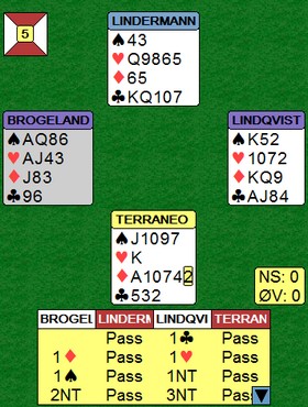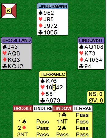 som de sier her på sørlandet. Espen tar for EK i ruter og godspiller først et ruterstikk hos spillefører før han skifter til kløver to. "Å, neida!", tenker spillefører. "Du lurer ikke meg fordi du har tross alt åpnet", og går opp på kongen. En beit!!
