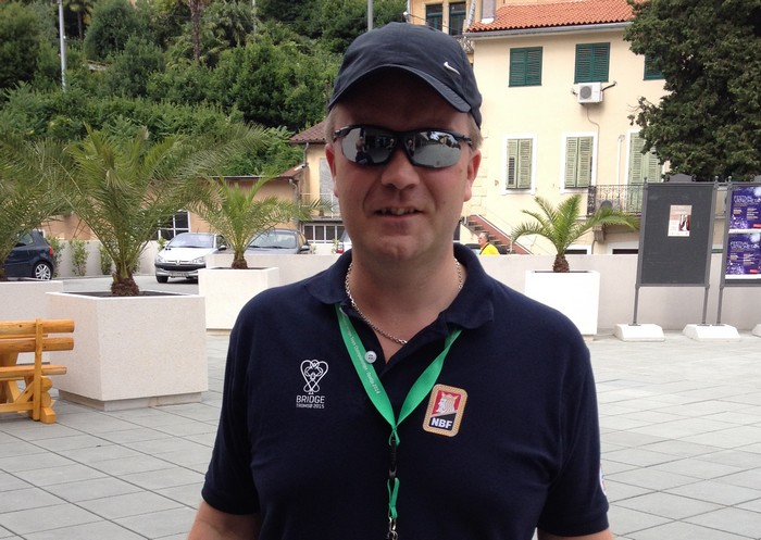 I spillet under fikk alle tolv eller tretten stikk. Espen Lindqvist fikk bare elleve og da må vel han være veldig dårlig? Det er Petter Haram som har sendt meg en mail som forteller at Norge fikk ruter fem (!!) i utspill. Den gikk til liten, tier og ess. Espen prøvde både kløver mot kongen og tre ganger hjerter til stjeling, men da ingenting av det gikk bra skjønner du helt sikkert hva som skjedde siden Espen har ruter 9 på hånda.