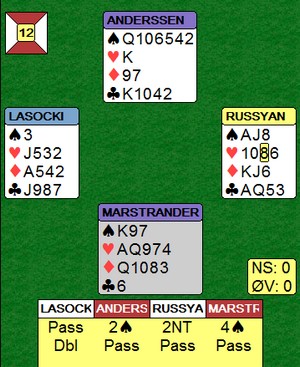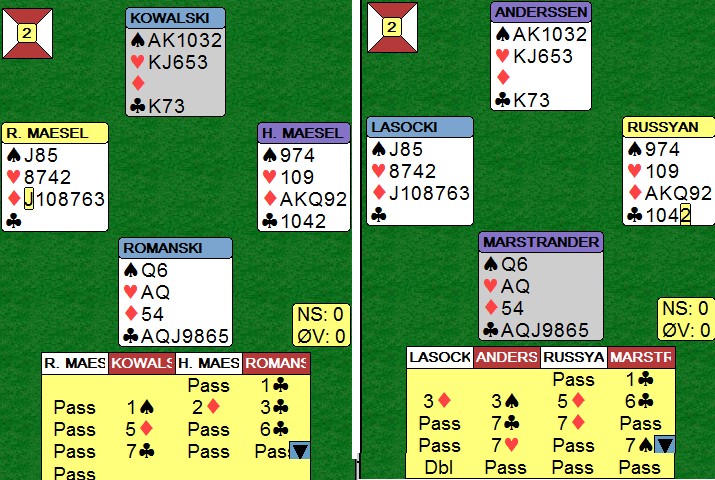 20 IMP på et spill!! Var det for tidlig på morgenen for Roald? Mange av oss hadde hoppet i ruter tidlig, men Roald valgte å ikke presse motparten. Han trodde kanskje det satt skeivt og at makker hadde noe i kløver? På det andre bordet så det ut som Norge gjorde rett da de meldte over stampen, men en lightnerdobling og kløver ut gjorde slutt på moroa!! "også kløveren 3-0 med tre hos utspilleren da!!! Helv...." Hvem har kløverkongen? Bridge når vi ser alle korta er en helt annen idrett enn det spillerne opplever. Kan du gå beit i 4sp med hjerter ut? Ja, og det er kanskje beste spilleplan til og med å gå beit. Rune Andersen spilte åpneren for kløverkongen og dro derfor en liten kløver mot knekten (!). Hvis vest har kongen må han stikk med den for å få for den og da er det to ruteravkast i nord. Motparten får ett i hjerter, ett i ruter og kløverkongen. Nå ble det beit når knekten ble stukket av kongen og ruter igjennom. På det andre bordet tok spillefører kløverkappen og ingen tenkte vel noe på at ti stikk var unormalt? Har draget forsvunnet litt for Norge? Det kan kanskje virke som det er safe å kappe kløveren siden ruterkongen er beskyttet. På en måte er det to ruteravkast, ett i kløver og et på hjerterkongen. Det hjelper lite fordi det er den tredje som forsvinner på hver sin hånd. Vest spiller selvsagt bare en kløver til eller hjerter når han er inne på kongen. Kjør på, gutter!! Jeg synes Roald og Helge var passive i minst to spill i innledningen, men så kom dette fine spillet. Mange hadde nok meldt i 1hj i vest, men Roald velger å doble for etterpå å vise som en sterk hånd med hjerter. I gamle dager hadde nord hoppa til 2sp og øst være ute av meldingsforløpet, men nå fikk Helge vist hjerter og litt kort på 1-trinnet. Nord spilte ut makkers farge, kløver, fordi han hadde jo ikke fått signaler om noe annet. 10 stikk til Norge når en spar forsvant på kløverkongen. På det andre bordet tok Rune "stampen" i 4sp, men ingen kunne jo vite at han bare kødda, så ingen bjelle og 100 ut. Dårlig gjort, makker!! Jeg liker Peter sitt hopp til utgang. Denne gangen hadde makker utstyrt seg med honnører i hjerter og kløver, akkurat det han ikke skulle hatt. Flytt en av kongen til ruter, så er det fint spill for 4sp. Nå måtte spillefører ta seg helt ut for å gå bare ei beit. Neste gang utstyrer du deg med bedre honnører til makker, Rune Andersen!!!