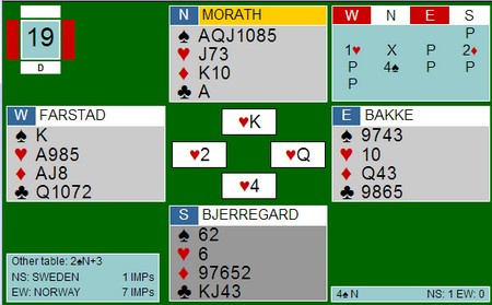1NT-åpningen fra Nunes i Syd viser 12-14 hp. Doblingen av 2 hjerter (overføring) fra Thor Erik ser ut til å være opplysende dobling og Thomas setter maks press med 4 hjerter. Fantoni i Nord har hørt makker vise god sparstøtte med 2NT og velger 4 spar. Det er nok en kombivariant, på en god dag står kontrakten og det kan også være en god stamp. Denne gangen er det hverken fugl eller fisk og +500 til Norge er 9 imp når Espen og Boye kjøper kontrakten i 3 spar med 2 bet på det andre bordet.