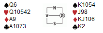 I spillet under skulle nok noen og enhver tenkt seg at ting hadde gått annerledes underveis. Et par var i 2hj med 10 stikk, et annet var i 4 hjerter med 8 stikk. Prøv deg sjøl i hjerterkontrakt fra vest sin hånd, med liten kløver i utspill fra nord (antagelig fra firekort):