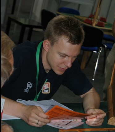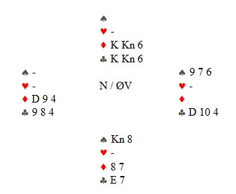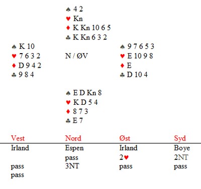 "Hei Boye. Er du midt i bæsjebyttinga på den lille eller har du noen minutter til meg?" Boye har et utrolig engasjement for bridge og han er mer enn noen annen opptatt av spillets finesser. Resultatet i ett og ett spill bryr han seg ofte ikke så mye om, men hvis det var en god prestasjon av makker eller han selv, blir han glad. Like glad som han blir lei seg når det spilles under pari. Derfor elsker han å snakke om spill, så jeg fikk grønt lys for å peise på. "Neida, jeg har akkurat hatt mitt skift som bleieskiftsarbeider. Jeg så du sendte en mail til meg om jeg kunne finne et interessant spill, så det skal du få om litt. Det er i kjent stil et spill der jeg ikke synes jeg gjorde det spesielt bra og jeg overså et fint spillepoeng. En dobbelssidig skvis forekommer ikke så ofte, men denne burde jeg sett" Før jeg får spillet spør jeg om han har noen tanker fra EM å dele med oss. Som de andre jeg har snakka med, er det positivitet over hele linja. Ledelsen gjorde jobben sin, spillerne samarbeidet bra, forholdene omkring var ok og stemningen var fin hele tiden. "Vi hadde en katastrofedag og selvsagt hang vi med nebbet den kvelden. Det holder ikke med 7 VP når 60 er maks og 30 middels på en dag." Jeg spør om han ser noen nærliggende årsak til kollapsen, men Boye mener det er ganske tilfeldig av kampene med store tap kom etter hverandre. "Du har skrevet om at vi nok hadde glid i starten av turneringa og vi var heldige i mange store spill. I det lange løp jevner dette seg ut og vi fikk totalt sett betalt omtent som forventet, spør du meg. Mot slutten sto ikke de slemmene som sto i innledende, selv om minst et par av dem i utgangspunktet var langt bedre kontrakter. Boye sier at han synes det er verre å spille mot Øst-Europeere enn andre. "Vi kjenner ikke stilen deres, de har litt andre systemer og kastene er heller ikke sånn som vi er vant med. Verken Bugaria, Romania eller Russland er særlig bedre enn oss over tid, mener jeg. Likevel sleit vi mot alle disse tre lagene. Kanskje ikke helt tilfeldig? "Jeg vil spesielt trekke fram Nils og Terje sin innsats i innledende. De gjorde nesten ikke feil de første dagene og spilte som de ikke skulle ha gjort annet enn å slå de beste europeerne. En strålende debut. Mot slutten gikk det ikke like lett, men totalt en sterk turnering fra dem. Vil du ha spillet mitt, eller?"