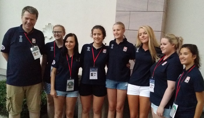 Spillerne fra høyre: Thea Lucia Indrebø, Charlotte Mikkelsen, Thea Hove Hauge, Sofie Sjødal, Marte Haugen Klingen og Stine Frøyse. Helt til venstre er kaptein, trener og coach, Sven Olai Høyland