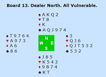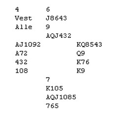 Jeg åpnet noe heldig med en ruter og dermed fant ikke Vest noen bedre melding enn pass. Helge i Nord svarte 1 hjerter og Øst meldte 1 grand. Jeg sa pass og nå tok Bjerregård en lang tenkepause.