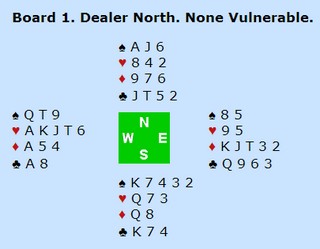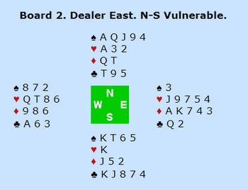 Bjerregård åpnet med 1 kløver og nå gjorde Helge det svært vanskelig for svenskene ved å melde to ruter. Morath i Øst doblet opplysende og Bjerregård meldte sin laveste majorfarge. To hjerter ble passet ut og to sonebet til de kjekke sørlendingene.
