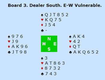 Seks kløver var nå kun avhengig av ess og konge i kløver hos makker. Med esset i spar i tillegg kunne jo storeslemmen være innen rekkevidde. Hvordan vise hånden sin? 4 ruter eller hjerter, vil det være sleminvitt med kløverfarge? Tankene streifet nok fortsatt innom spill 1 og dermed valgte han det "safe" og meldte tre grand. Synd at ikke Helge hadde spar konge, da ville det bli bet med spar ut i en kontrakt hvor minorslem stod.