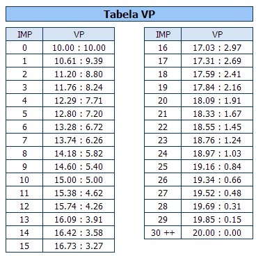 Jeg vet ikke helt hvorfor den nye VP-tabellen har blitt innført. Det skjedde uten noen diskusjon og plutselig var uavgjort kamp 10-10 istedet for 15-15 som det hadde vært i en årrekke. Selve omleggingen fra å dele 30 VP til å dele 20 VP, er ikke poenget. Tabellen er alt for "trang" i bånn! Roald Mæsel nevner det i sin artikkel fra EM der de spiller 16 spilli runden. Enda MYE verre er det når antall spill reduseres til seks eller syv som vi skal bruke under Åpent NM lag. I den pågående lagturneringa i Sopot i Polen ser jeg at de bruker denne skalaen.(Jeg er ikke sikker på hvor mange spill det er i runden. Jeg tipper syv)