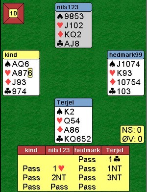 Hei Snorre. Kan du publisere dette på bloggen ? Steinkjer Open er en ny turnering som vi startet i fjor og med noen små justeringer i forhold til helga, håper vi å få dette til å bli en storturnering som trekker masse folk. Det blir parturnering på lørdag og lagturnering på søndag med 10000-6000-4000 på de 3 første plassene hver dag. Vi har allerede fått påmelding fra et svensk lag og håper på enda flere østfra. Da er det bare å melde seg på så skal vi gjøre alt for at dere får en trivelig helg i StorSteinkjer :) Innbydelse her: http://www.bridgekrets.no/var/fckeditor/steinkjerbk/file/Steinkjer%20Open%202014.pdf Påmelding par: http://bridge.no/ruter/turneringsinfo/1/1056 Påmelding lag: http://bridge.no/ruter/turneringsinfo/1/1057 Du er herved invitert til å ta turen opp til trivelige Trøndelag, og så må du hilse Tom Anders Høiland fra meg :) Han besøkte oss på hytta under bridgefestivalen etter å ha blitt slått ut av NM-par. Han snakket mye om uglid og gli mellom rødvinsglassene ja, å så hadde kaninen gjort mye rart da :) Her er også et spill (24) fra mellomheat A NM-par. Det skulle vise seg å bli dyrt å melde inn på 2-trinnet med en dårlig farve mot oss. Meldingsforløpet var kort med nord som giver: pass-1hj-2kl-x og pass rundt, Motspillet gikk av seg selv og vi noterte +500 og ren kasse. Ikke hver gang en dobler negativt med 6-6(sikkert mange meninger om denne doblingen) men rett ble det da makker så at dette var god butikk :)