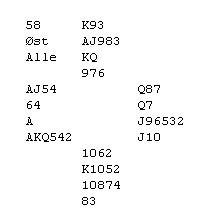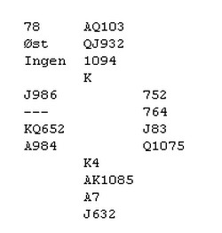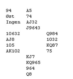 pass 6hj 2NT viser åpning og minst fire trumf. 3kl er tillegg og naturlig. Nå har jeg flere mulige meldinger. Jeg kan spørre etter singel med 3hj og be om cuebid med 3NT. Ønsker jeg å viser kløverkongen min som singel, kan jeg melde 4kl Det ser ut til at det er viktigere i dette spillet å vite hvor honnørene hans er, enn å finne kortfarge. Skyulle jeg få 4ru (singel) over 3hj, sliter jeg med å finne ut hvilke svarte honnører makker har, og kontrakten vil fort i beste fall henge på en sparkapp. Jeg melder derfor 3NT som ber om billigste cuebid og det blir blink når makker ikke har kløveresset. (Får jeg 4kl, vil jeg gå ned i 4hj og spille ballen over til makker) På 4ru ser jeg at han med stor sannsynlighet har sparkongen og uansett hvilken fordeling han har i spar/ruter, vil det ikke være tapere der. (Litt heldig at 4ru ble doblet slik at Boye kunne vise esset) Det kan være en femtenpoenger med Jx,EKxxx,Ex,DJxx som gir beit med ruter ut og sparkappen ikke går. Det tar jeg sjansen på og blir belønnet med 20 av 22 mulilge plusspoeng. HER ER TO SPILL FRA LØRDAG