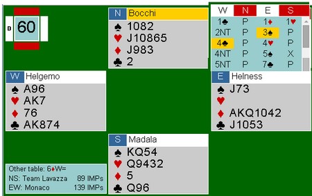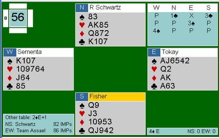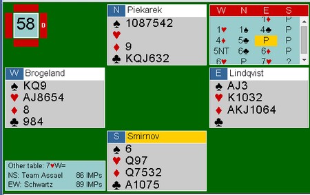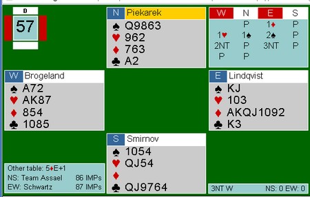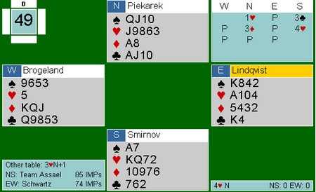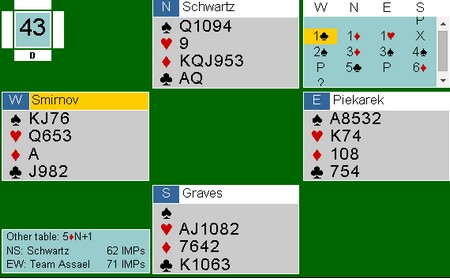 Nationals kan bli avgjort av kvaliteten på sponsorparet. De må spille to sesjonen (32 spill). Schwarz har Allan Graves og Richard Schwartz, mens Monaco har Franck Moulton og Pierre Zimmermann. Det blir også spennende å se hvordan de bruker sposorparene. Det mest vanlige er at de spiller tidlig og ikke er med i de avgjørende 16 eller 32 spillene. Vi får se. Aller mest moro hadde det vært med Boye og Espen mot Tor og Geir i siste sesjon der resultatet hadde vært jevnt. Her er et fint spill av Richard Schwatz og Allan Graves. Slemmen ble ikke meldt på det andre bordet i semifinalen.