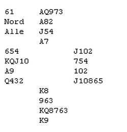 sa Espen og Boye til Piekarek etter denne litt sløve spilleføringen. Espen greip sjansen han fikk og vant dermed 6 IMP istedet for å tape det samme siden det ble spilt 3sp +170 på det andre bordet. Espen startet med ruter til knekt og ess. Så hjerter til bordet og kløverkapp. Nå gikk toget! Espen fortsatte med kløver, stakk hjerteren med esset, spilte inn Boye i ruter og fikk kløverstjelilngen sin. Jeg og du har selvsagt tatt ut trumfen med en gang og aldri latt ØV få denne sjansen, men det er noe med å ta de mulighetene en får ved bordet. _______________________________________________________________________________ Her er et spill til i samme kategori, men denne gangen med Fisher - Schwarz som gribber. Syd spilte ut kløverdamen som han fikk beholde for. Skift til tre ganger hjerter. Nå måtte øst trumfa med esset og kappa på tieren i bordet for å finne Det klarte han ikke og en beit. Det ser sløvt ut å ikke stikke den første kløveren, men øst ville vel vente å se hva som skjedde før han skulle ut å gjette trumfdama. Det slapp han!! All ære til syd som i stikk to fant hjerterskiftet. Det er fort gjort å spille med kløver. Boye og Espen stoppa i 3sp på det andre bordet og vant 5 IMP istedet for en utgangssving ut.