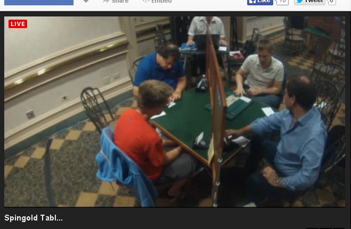 Lagturneringa i det amerikanske Summer Nationals, "Spingold", er ved siden av Cavendish den konkurransen bridgespillere helst vil vinne. I natt gikk lag Schwatz med blant annet Boye Brogeland og Espen Lindqvist til topps. I finalen vant de med med sifrene 142 -115 over verdens mestvinnende lag de siste årene. Monaco. Her er Espen og Boye i kamp mot Fantoni - Nunes i den tredje sesjonen. Mange norske fulgte finalen. Dette er fra klokka 02:30 på natta og det er bare mine venner. Over 6000 fulgte sendingene.