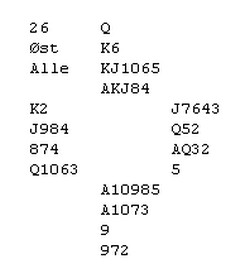 Øst åpnet med 1NT og syd meldte inn 2NT. Nord var litt fraværende og glemte å alertere. Da passet makkeren til 1NT-åpneren og ropte kjapt på politiet når nord straks etterpå våknet fra dvalen og sa at 2NT ikke var naturlig, men to farger. Jeg vet ikke resultatet av saken, men jeg griner blod hver gang noen prøver seg på dette. Ingen hvite, levende mennesker i en forbundsturnering melder inn 2NT naturlig over en sterk NT og det vet også motparten. Da skal en kikke bort på makkeren til han/hun som meldte inn, evt kakke han/hun forsiktig i panna og be hen/henne våkne og forklare, hvis det i tilfelle er ønskelig. Stakkar turneringsleder må nesten følge boka og dømme mot den feilende siden. Slike poeng vil i alle fall ikke jeg ha!!