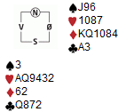 Som sagt så gjort,. men pasienten døde. Kløver 9 tolka Boye som at jeg hadde 98 i kløver og spilte fargen rundt til åtteren til spillefører. Påtrøkk de luxe og en elendig score for -110. "Nei, Snurr. Det er ikke Lavintahl i denne posisjonen". Jeg bøyer hodet i skam, men spør ærbødigst hvordan vi skulle klart dette hvis vest hadde hatt f.eks kløver knekt og spillefører K10, slik at jeg MÅTTE tidlig inn? Dette også gitt at spillefører han dobbel ruter.