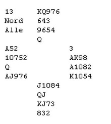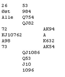 Som jeg har sagt flere ganger de siste to dagene, er det krevende å spille med de beste. Jeg er fristet til å si at de i enkelte spill gjør det unødvendig vanskelig og setter store krav til makker. For meg er det lite trøst i å vinne diskusjoner etterpå når makker ikke forstå hva jeg mente med meldinga mi, uansett hvor bra den nå skulle vært. En bånn er og blir en bånn uansett hvem i makkerparet som skulle hatt "rett". I bridge er det lite sannheter og når gode spiller har til dels svært ulik oppfatning av hva fasiten er, bør en kanskje leite etter enklere løsninger? Den største grunnen til at par velger å spille sterk kløver, er at de oftest får mer plass til å uveksle informasjon når de er i slemsonen. Både 2kl og 2NT-åpning er svakheter i et naturlig system fordi det er så lite plass igjen. Spesielt hender som inneholder en major og en minor viser seg gang på gang å volde problemer. Begge major og begge minor går oftere bra. Jeg vet ikke hvordan du tenker i dette spillet? Du sitter syd og åpner med en svært tung 20-21 NT. Mange ville sikkert oppvurdert til 22-24, men det er bare ett ess i hånda. Viser jeg 22-24 og makker har 6-7 poeng er han i slemsonen med en gang og det kan fort være to esser vekk. Det er i min verden ikke ulovlig å ha maksimum, så derfor 2NT i åpning. 3kl er Puppet og 3NT benekter fire/fem major. Så kommer 4kl fra makker som i min verden er naturlig sleminvitt. Han sliter med begge minor, men han kunne meldt 3sp over 2NT for å vise det. Om du har system for 1-4-4-4 eller 4-1-1-1 vet jeg ikke. Her i gården er det nakent for det. Jeg kan ikke gå rett i Blackwood over 4kl, fordi 4NT er vil være avslag. Derfor vil jeg tro alle er enig med meg i 4ru. Så kommer 5NT fra makker, Boye Brogeland. Hva i all verden mener han med det? Vi skal ikke spille storeslem når makker ikke har til Blackwood. Når er god spiller melder noe rart, må han ha en grunn. 5NT når trumfen ikke er helt bestemt betyr "Pick a slam", så det er min første tanke. Har han f.eks 3-1 i major og 4-5 i minor, vil han ha et meldeproblem over 2NT. Viser han begge minor med 3sp, vil han ikke finne 5-3 i major. Så begynner jeg å tenke på hjerterfargen. Det ser ikke helt umulig ut at makker har to små hjerter og da er det viktig at jeg er spillefører siden kløverkontrakt har kommet på hans hånd. Han har neppe mer enn tolv poeng fordi da hadde han nok meldt Blackwood, men mot 20-21 bør han vel ha minst 10, kanskje elleve også. Hva er så igjen til ha. I major mangler det tre poeng i spar og syv i hjerter, i tillegg ruter knekten og minoressene. Det er vanskelig å finne en hånd hos makker uten to ess, men DJ i begge major og et ess blir ti. Det er vel for tynt? Da virker det som han har to ess og minst to lavhonnører i major. Jeg går for omtrent denne hånda: -,xxx,EJxx,Exxxxx. Han gir meg muligheten til å spille ruter hvis jeg ikke skulle ha god kløvertilpass. Du ser også at det er vesentlig å få kontrakten på min hånd. Det er noe som skurrer siden han kanskje ville meldt 3sp på denne hånda over 2NT, men søkte han etter 5-3 i hjerter? Når han ikke cuebidda over 4ru, men hoppet til 5NT må han vel ha en renons et sted? Det jeg i alle fall ikke har lyst til er å spille 6kl fra nord. Kartet stemte heller ikke denne ganger med terrenget når jeg meldte 6NT. En kommentar fra noen kanskje?
